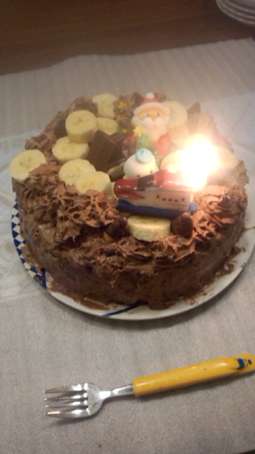 息子と作った「チョコ好きの、バナナ好きによる、新幹線好きためのチョコケーキ」